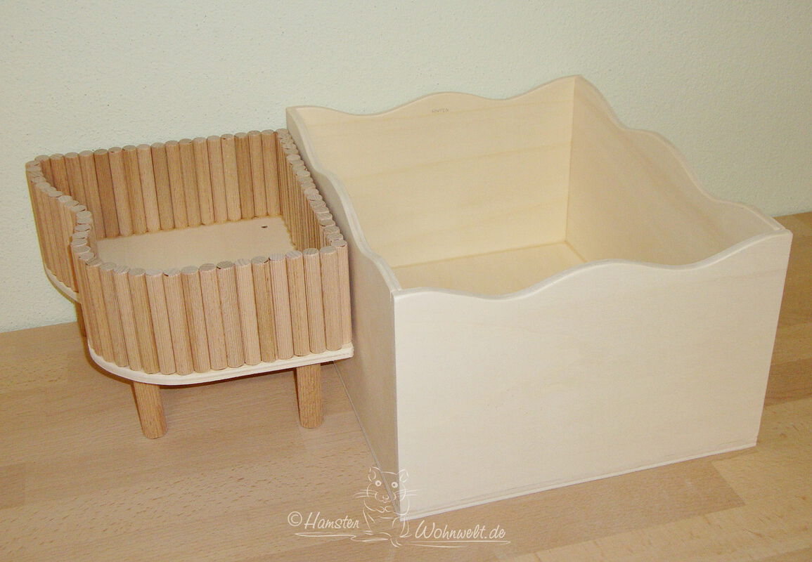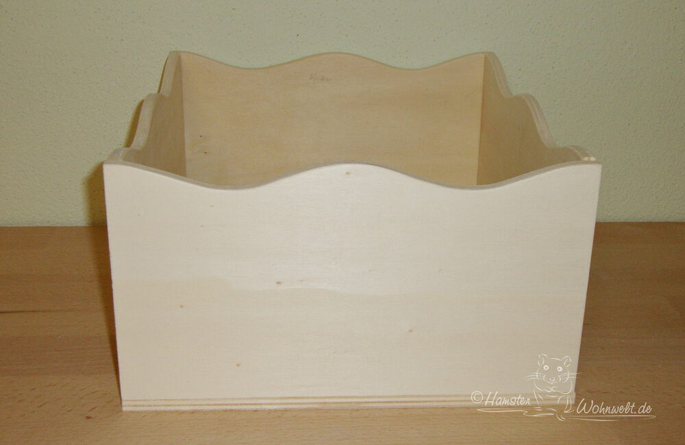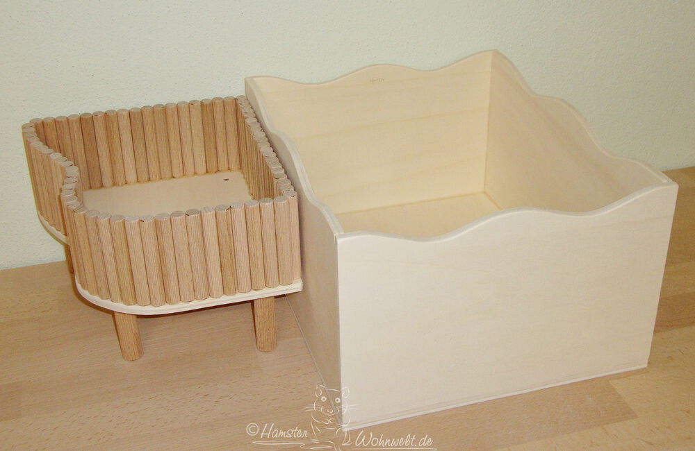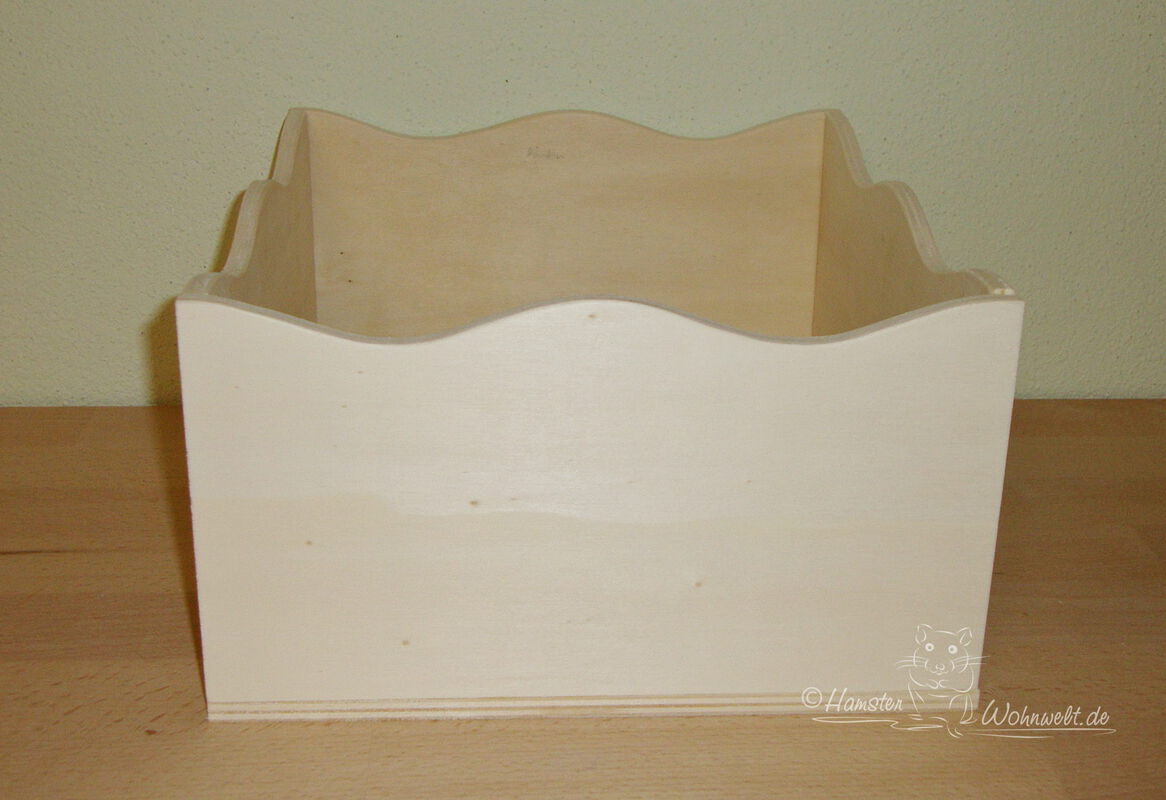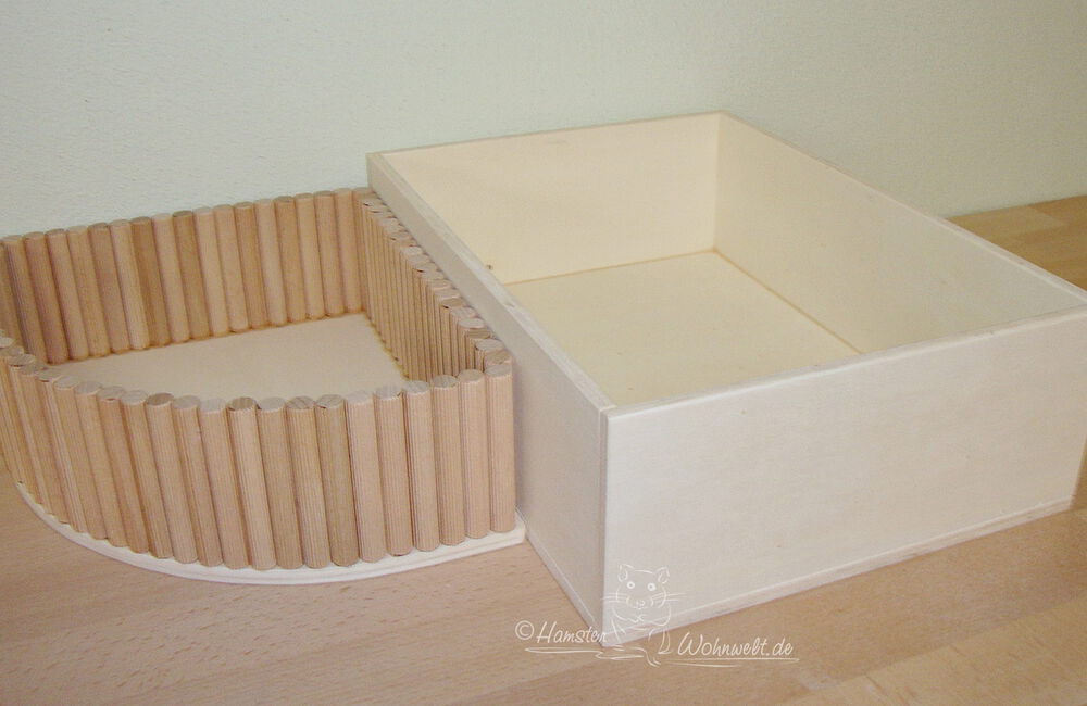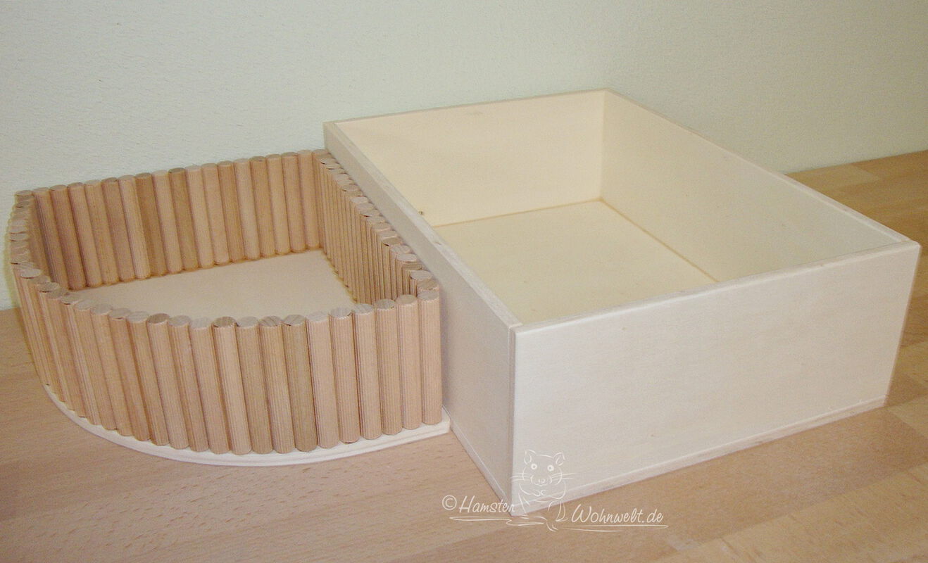 Meine Buddelboxen aus der Hamster-Wohnwelt-Werkstatt sind individuell auf Ihre Gehegemaße abgestimmt. Ich fertige Boxen entweder vier- oder rechteckig aus dickem Pappelholz, oder geschwungen aus geriffelten Buche-Riffelstäben an. Letzteres erlaubt gewisse "Form-Freiheiten" - so kann ich ovale, runde, halbrunde, eckige, dreieckige (usw.) Boxen anbieten.