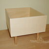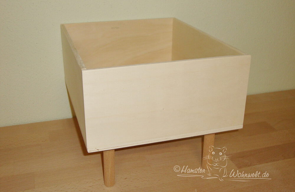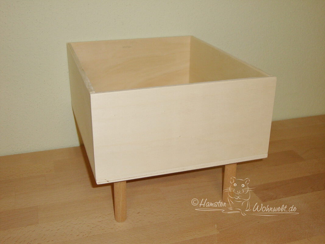 Meine vier- und rechteckigen Buddelboxen fertige ich aus 8-10 mm dickem Pappelholz an. Die Buddeltiefe ist individuell, regulär 8 - 12 mm; bei Gehegen mit 15 cm oder mehr Einstreuhöhe wird die Box auf angeschraubten Stelzen stehen und somit für spätere Verwendung in anderen Gehegen höhentechnisch veränderbar sein.