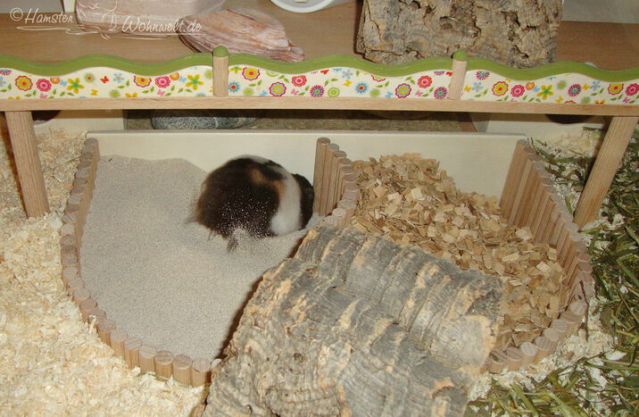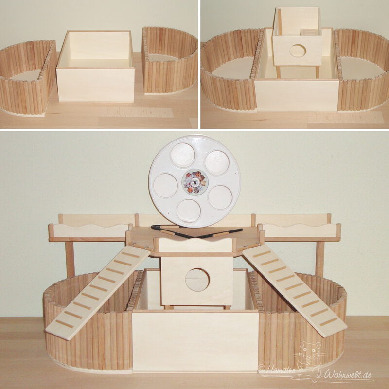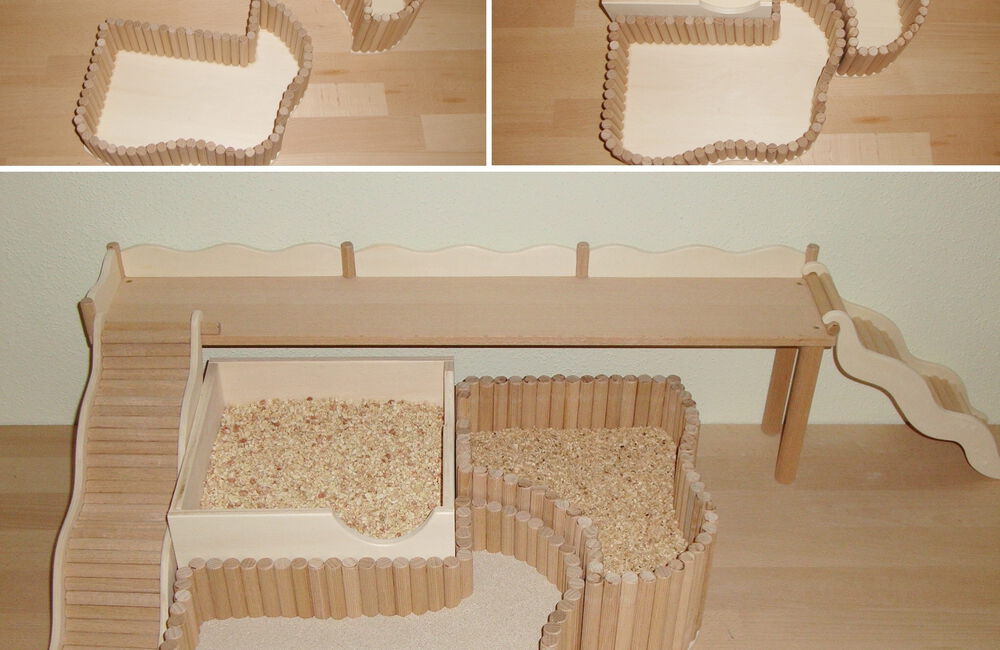 Viele Hamsterbesitzer möchten ihren Tieren noch mehr Beschäftigung und Abwechslung durch verschiedene Einstreu-Arten anbieten; hierzu fertige ich gerne - je nach Gehegegröße - auch mehrere Buddelboxen an. Diese Buddelbox-Kombinationen ermöglichen verschiedene Größen und Einstreutiefen jeder einzelnen Box und nehmen zugleich so wenig Platz wie möglich im Gehege ein.