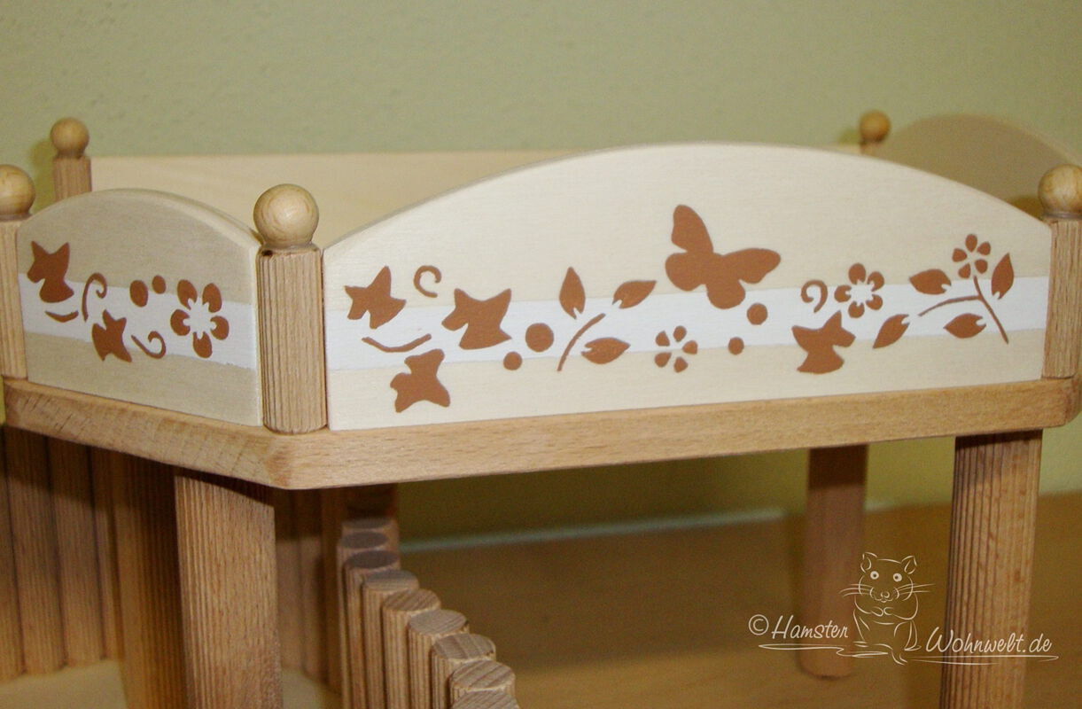 Das Geländer der Wiesenblumen-Einrichtung ist mit vielfältigen Blüten und Gräsern verziert, die auf das Holz aufgemalt werden. Auf weißem Untergrund kommt die in grün oder auf Wunsch andersfarbig gehaltene Verzierung besonders gut zur Geltung. Die Bemalung wird von mir in akribischer Handarbeit gefertigt; ich verwende hierfür ausschließlich ungiftige Acrylfarben auf Wasserbasis.