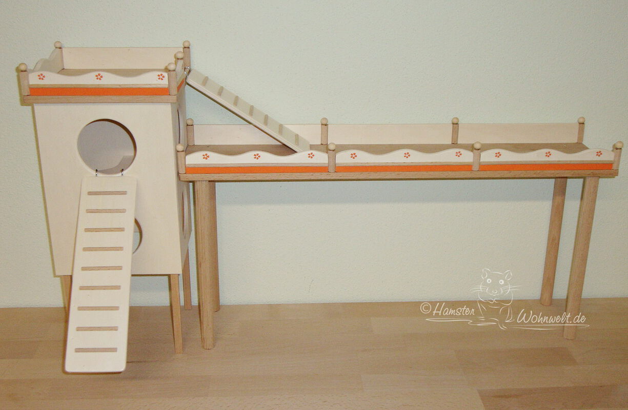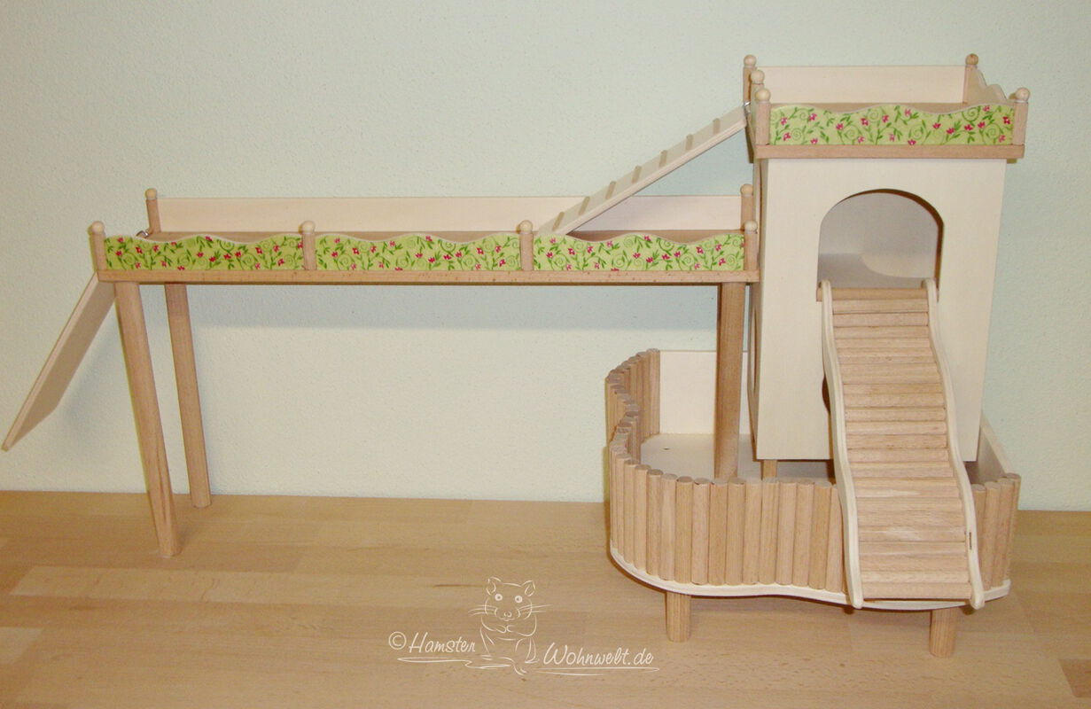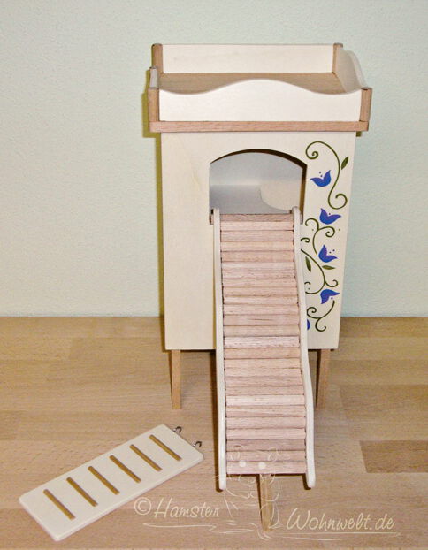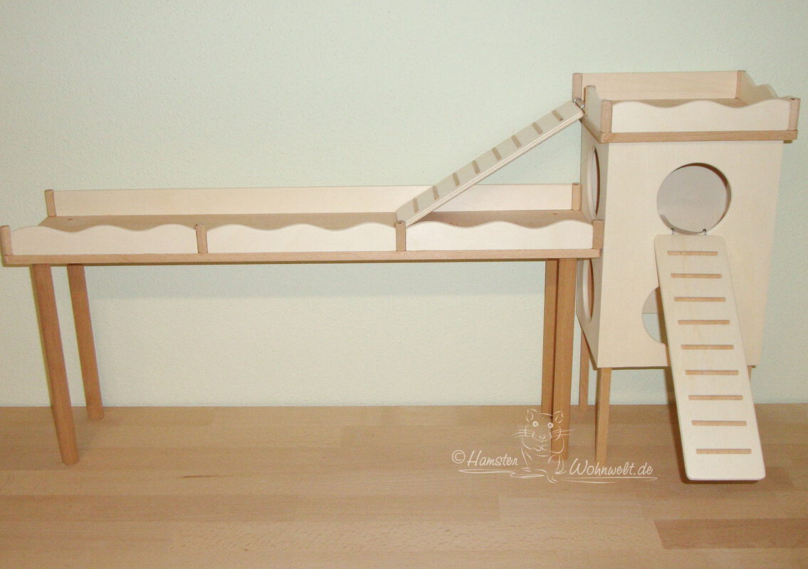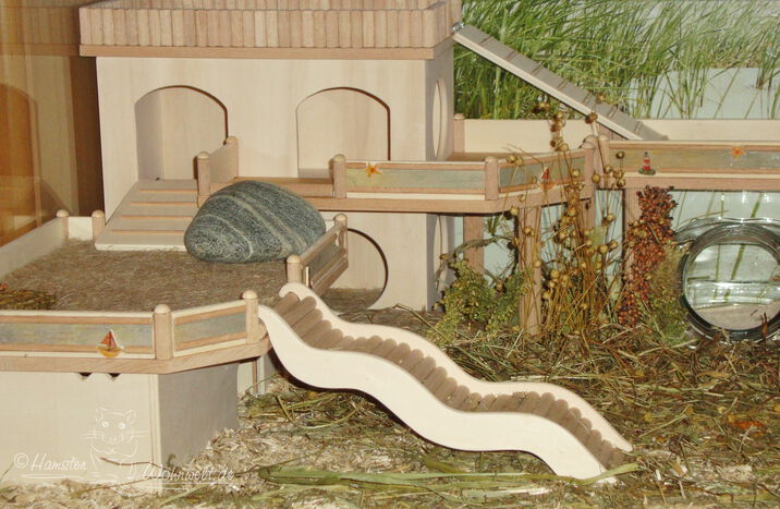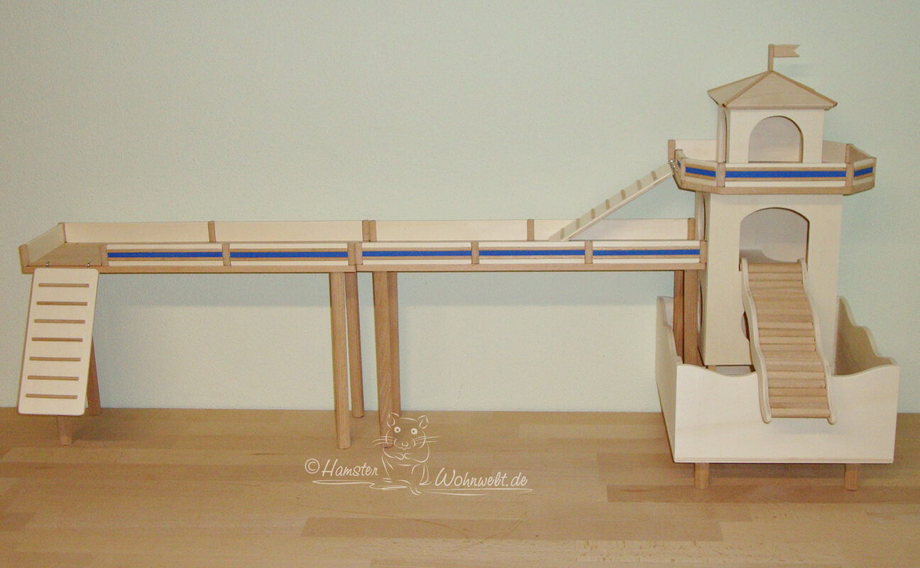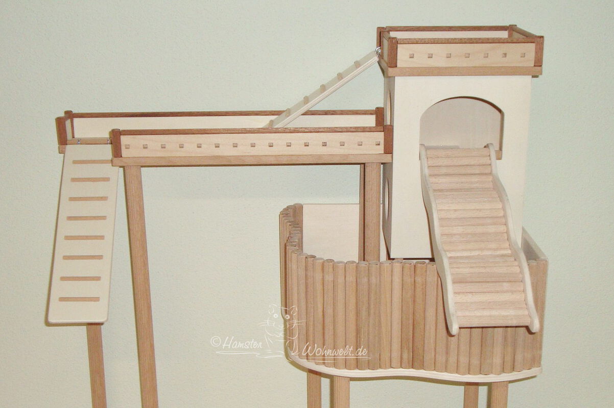 Grundsätzlich beinhaltet ein Kletterturm ein oder zwei einhängbare, gerade Rampen für den Auf- und Abstieg des Turmdaches sowie des vorderen, oberen Durchgangslochs. Diese Rampen tausche ich auf Wunsch gern durch eine geschwungene Abenteuerbrücke aus, die dann dort eingehängt wird. Diese Brücken geben dem Tier guten Halt durch die geriffelte Oberfläche, und somit wird für dem Nager das Beklettern sicherer und auch noch im hohen Alter möglich gemacht.