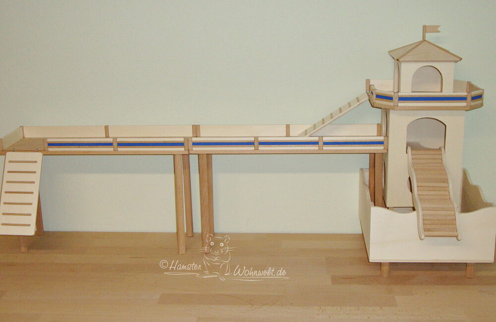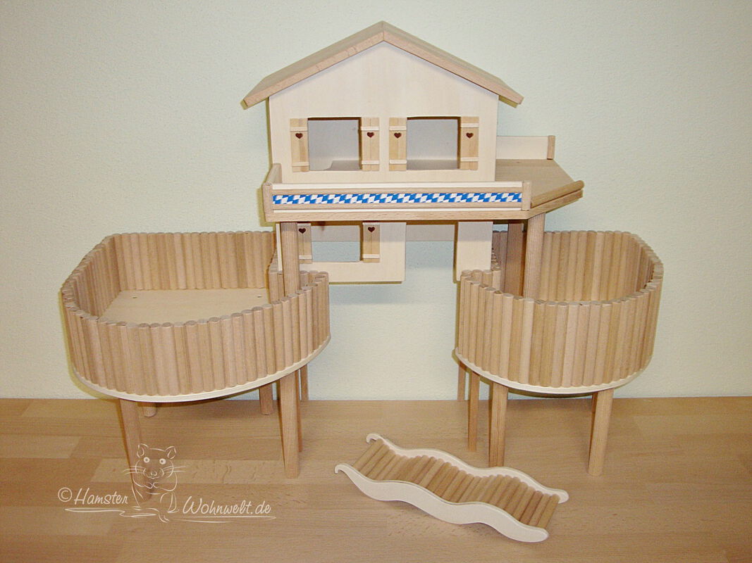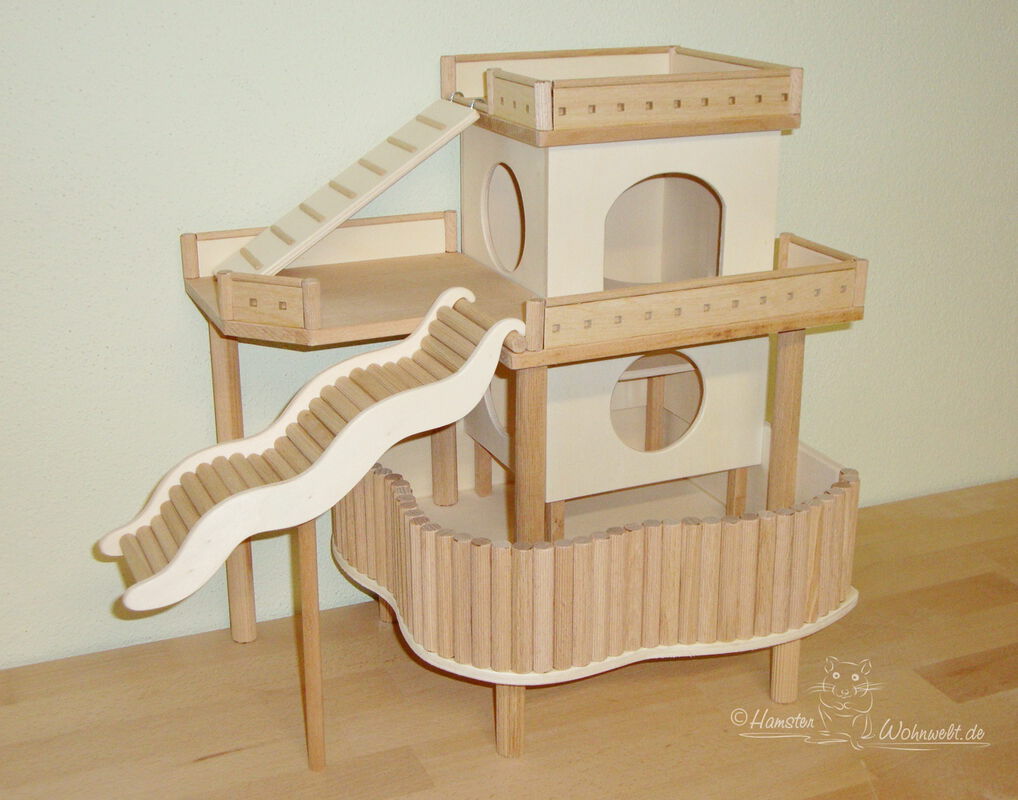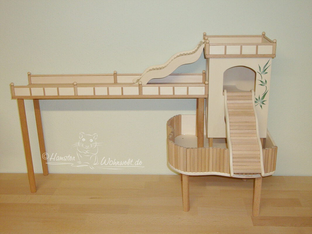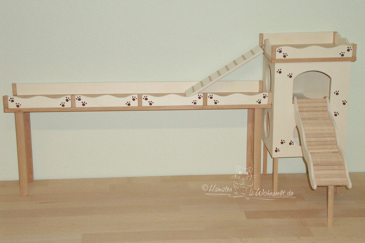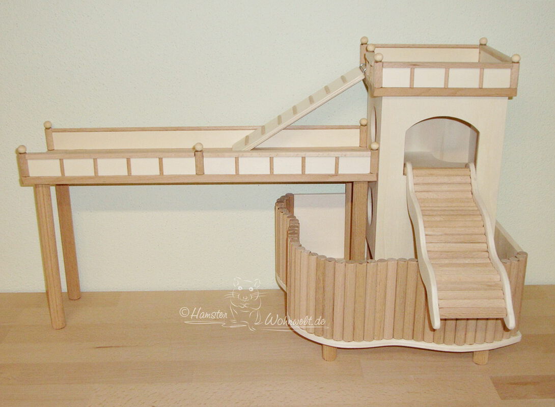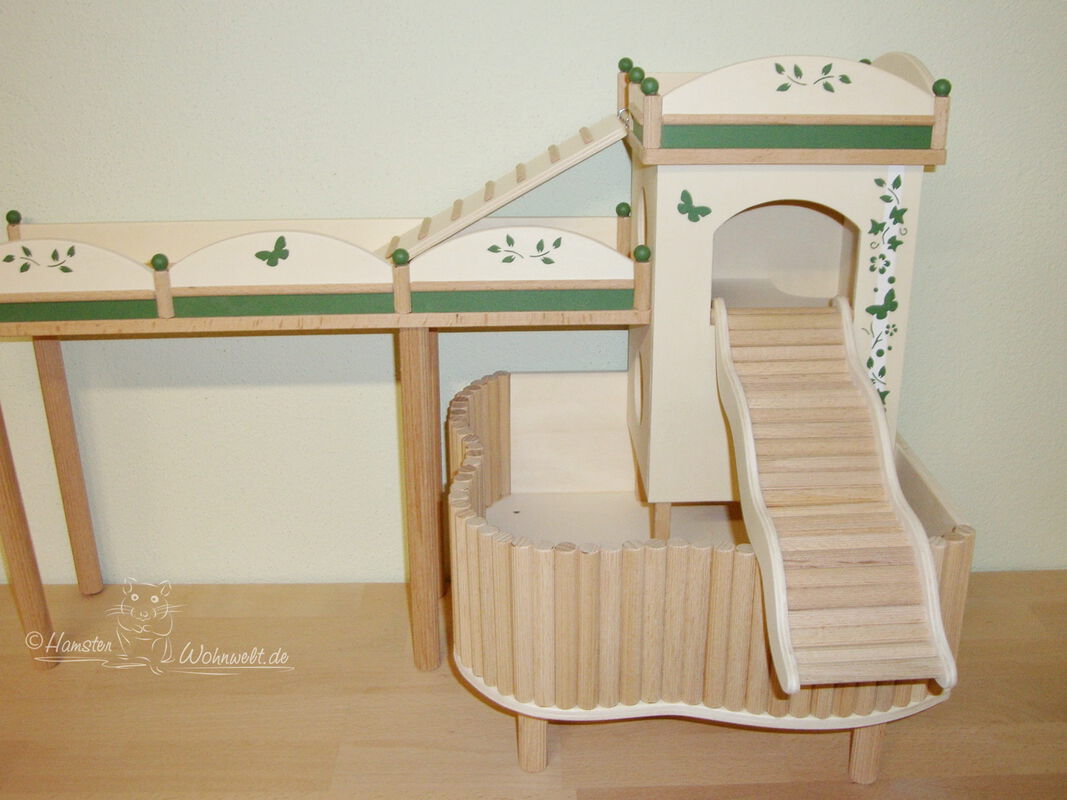 Grundsätzlich beinhaltet ein Kletterturm ein oder zwei einhängbare, gerade Rampen für den Auf- und Abstieg des Turmdaches sowie des vorderen, oberen Durchgangslochs. Diese Rampen tausche ich auf Wunsch gern durch eine geschwungene Abenteuerbrücke aus, die dann dort eingehängt wird. Diese Brücken geben dem Tier guten Halt durch die geriffelte Oberfläche, und somit wird für dem Nager das Beklettern sicherer und auch noch im hohen Alter möglich gemacht.