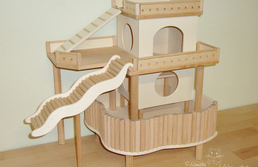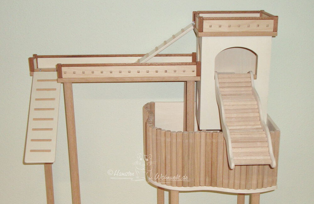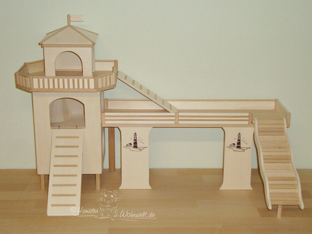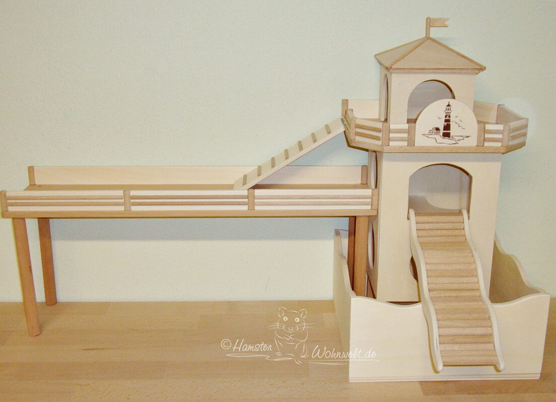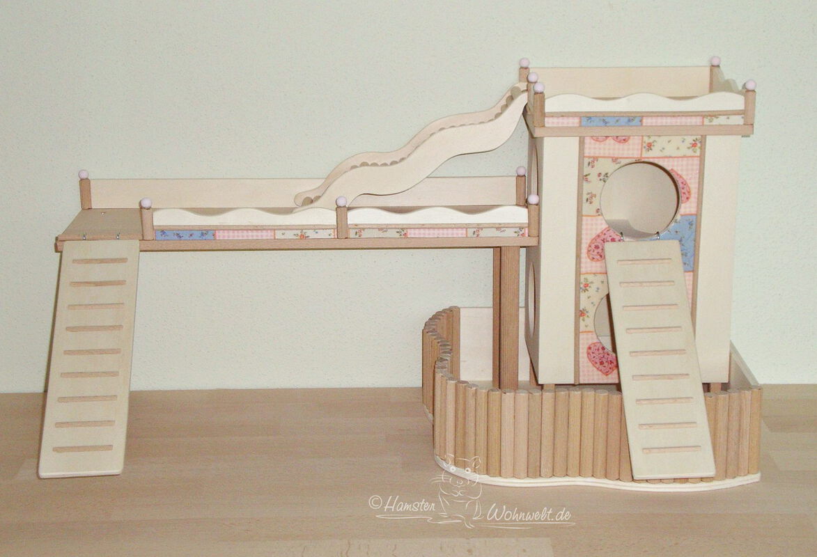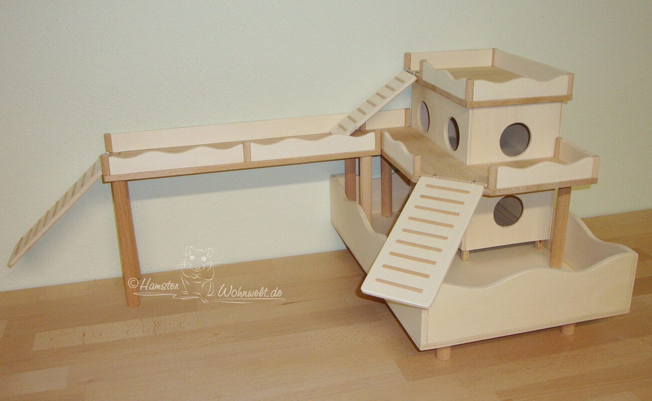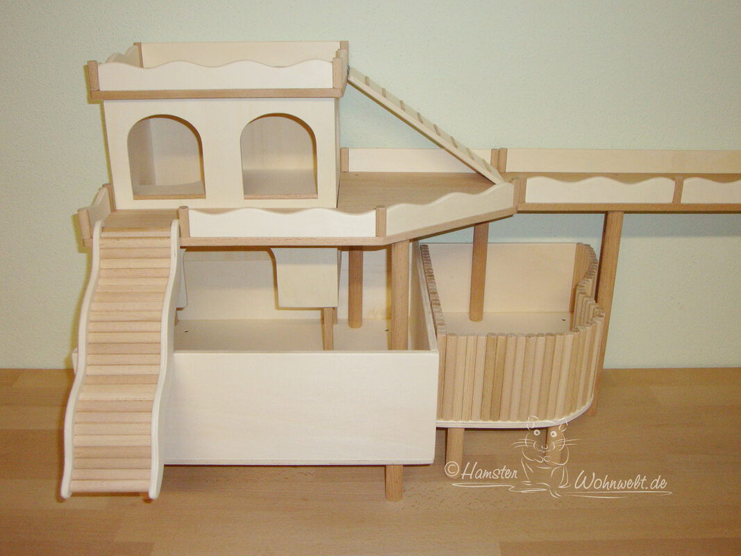 Grundsätzlich beinhaltet ein Kletterturm ein oder zwei einhängbare, gerade Rampen für den Auf- und Abstieg des Turmdaches sowie des vorderen, oberen Durchgangslochs. Diese Rampen tausche ich auf Wunsch gern durch eine geschwungene Abenteuerbrücke aus, die dann dort eingehängt wird. Diese Brücken geben dem Tier guten Halt durch die geriffelte Oberfläche, und somit wird für dem Nager das Beklettern sicherer und auch noch im hohen Alter möglich gemacht.