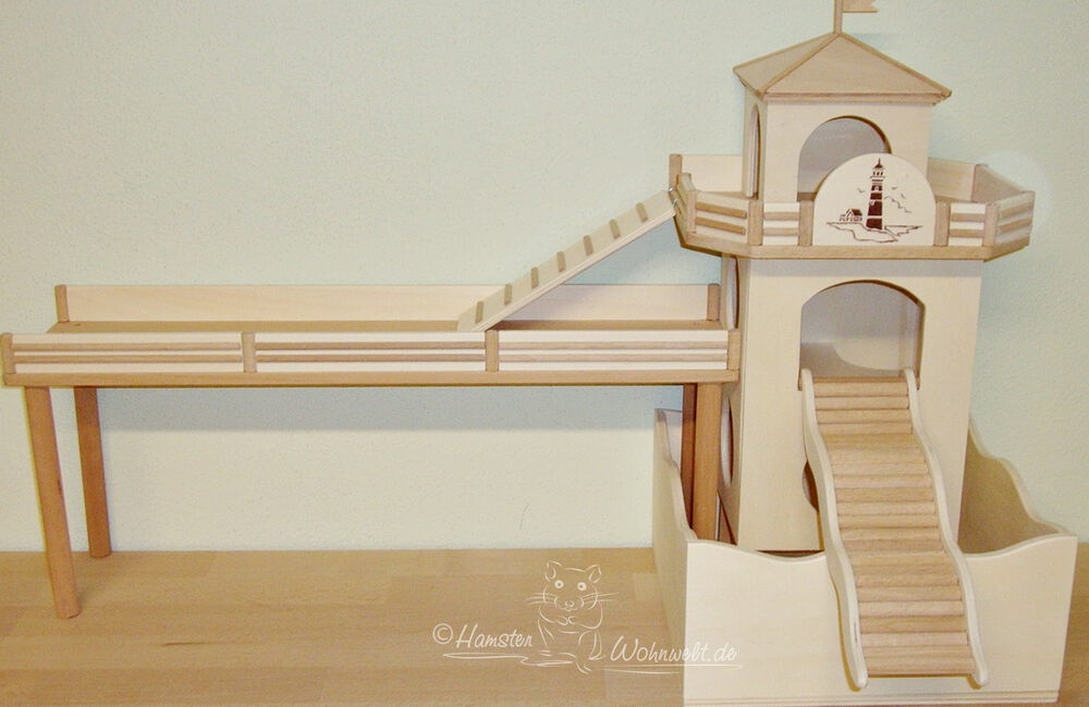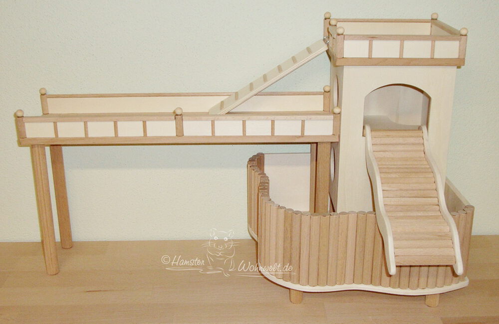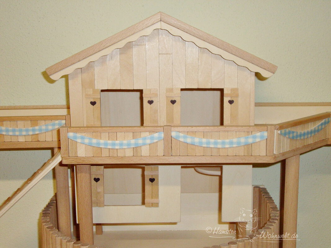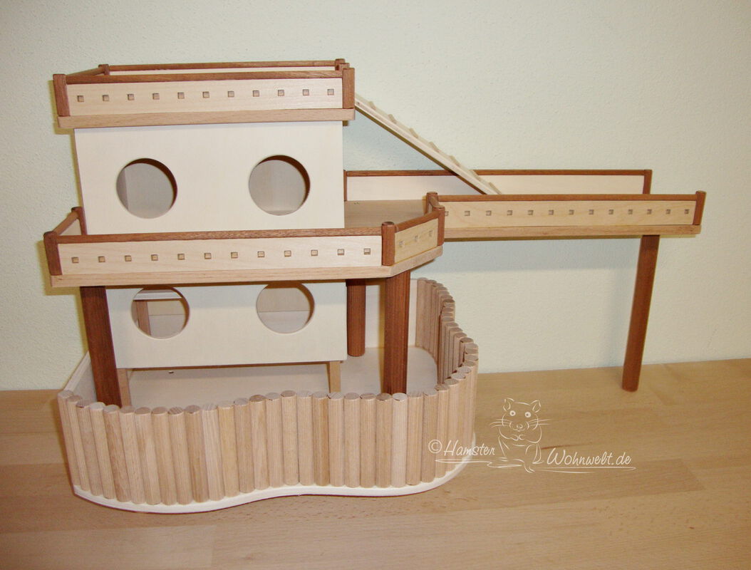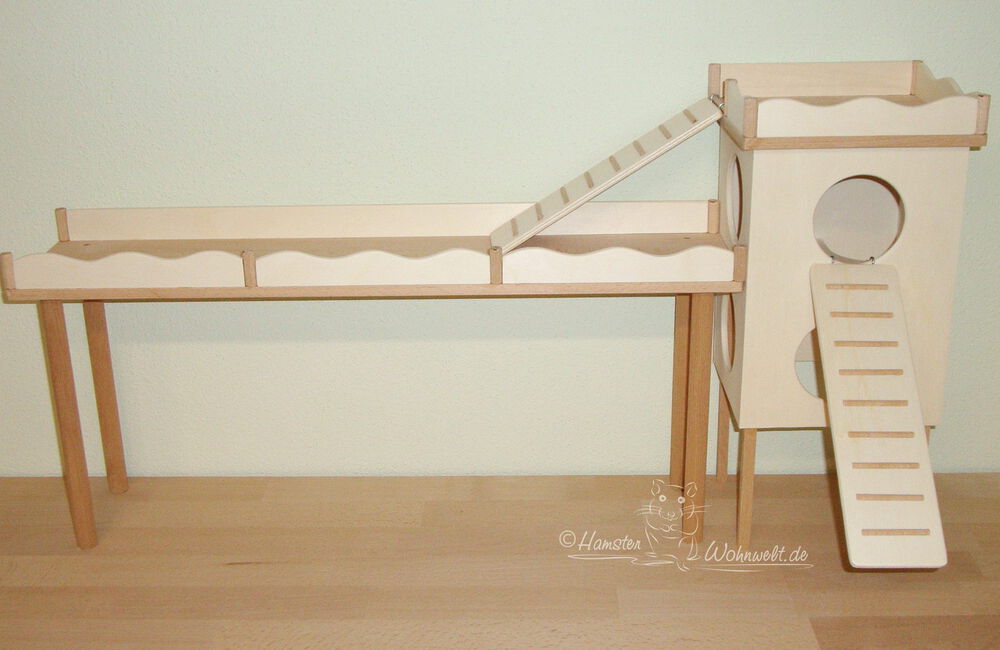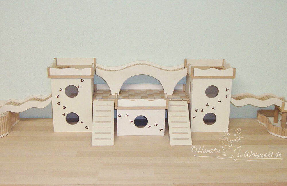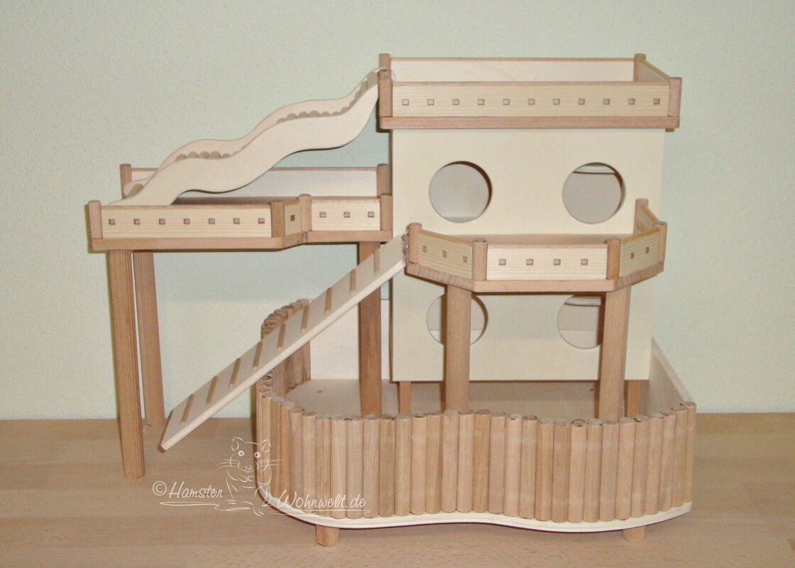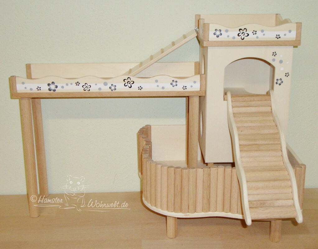 Grundsätzlich beinhaltet ein Kletterturm ein oder zwei einhängbare, gerade Rampen für den Auf- und Abstieg des Turmdaches sowie des vorderen, oberen Durchgangslochs. Diese Rampen tausche ich auf Wunsch gern durch eine geschwungene Abenteuerbrücke aus, die dann dort eingehängt wird. Diese Brücken geben dem Tier guten Halt durch die geriffelte Oberfläche, und somit wird für dem Nager das Beklettern sicherer und auch noch im hohen Alter möglich gemacht.