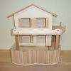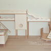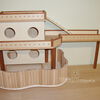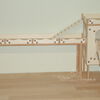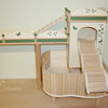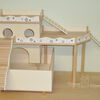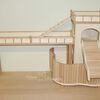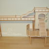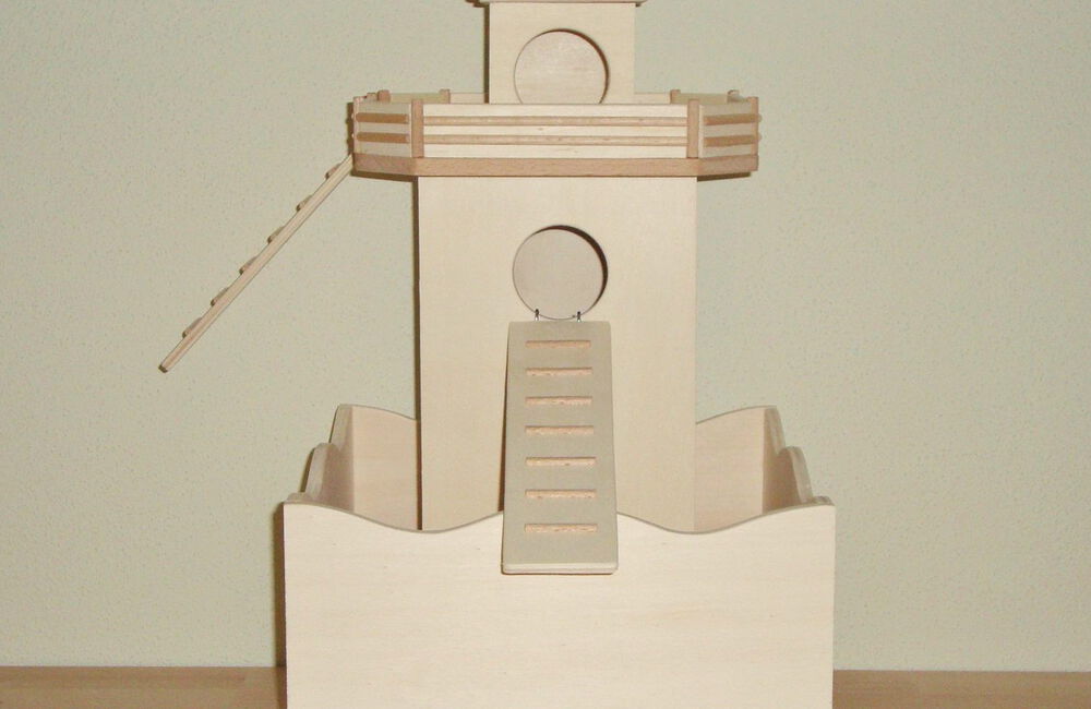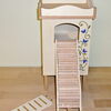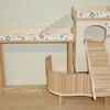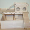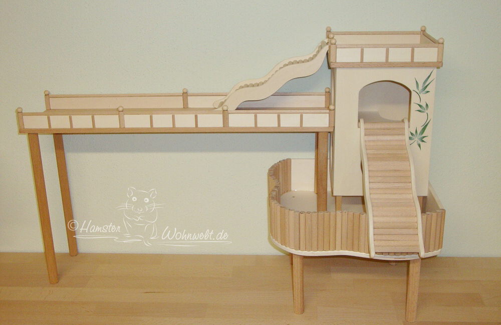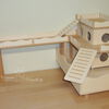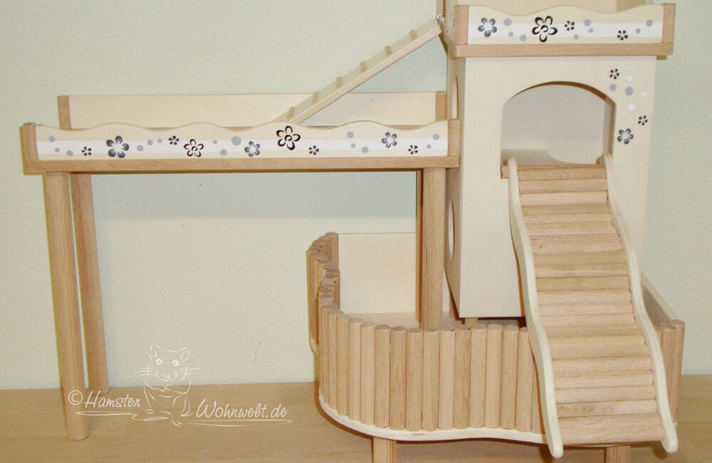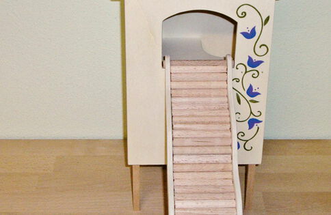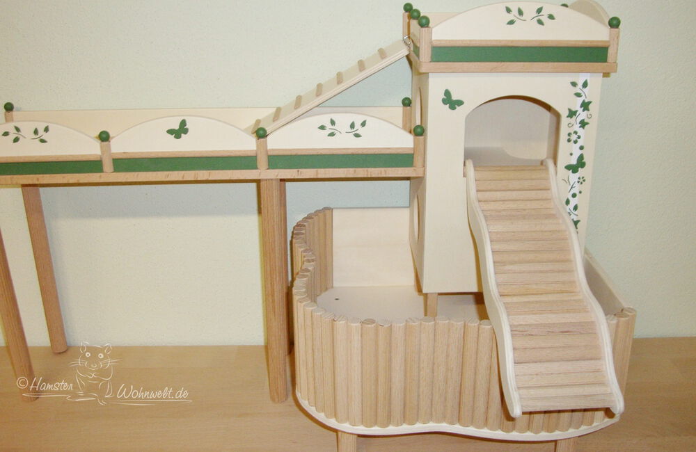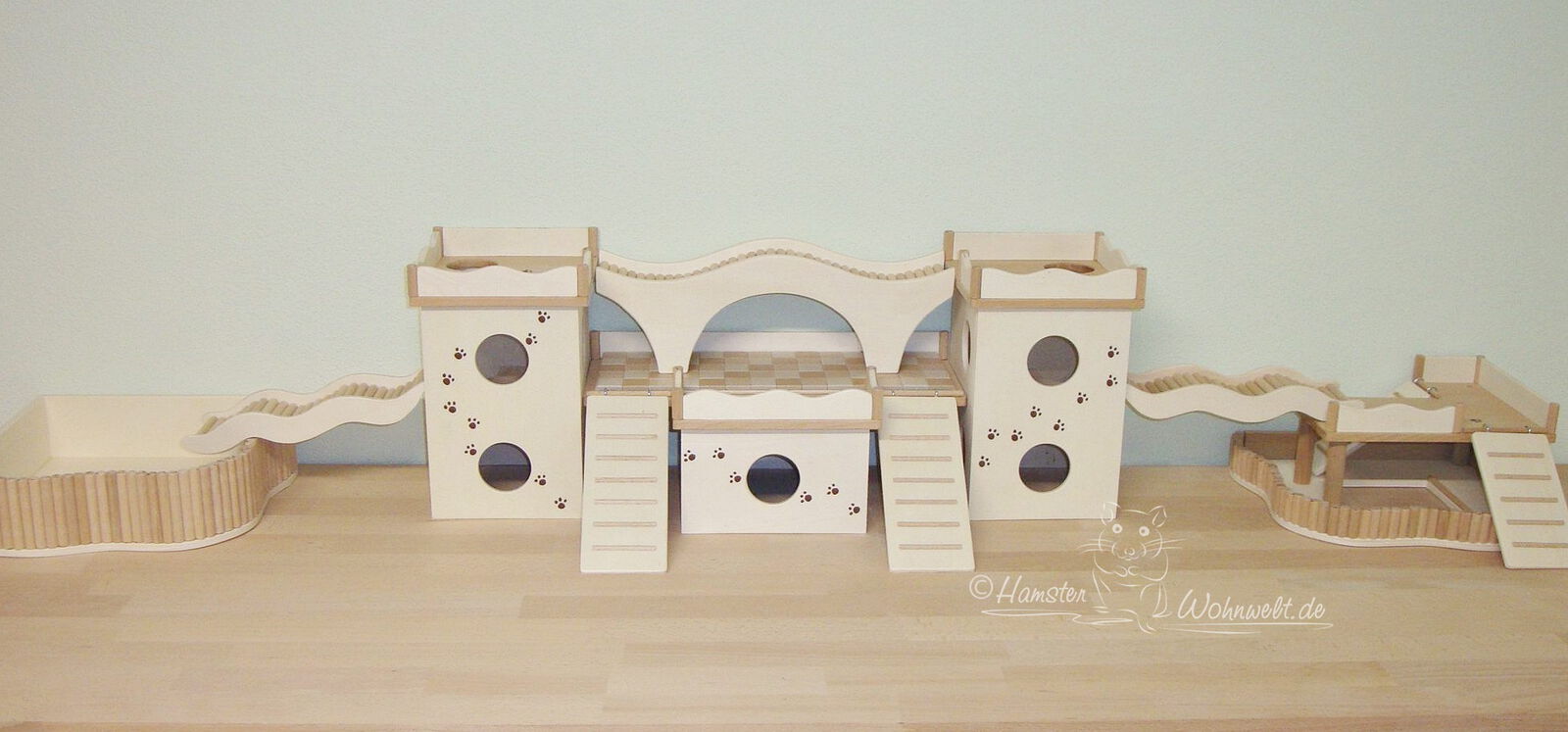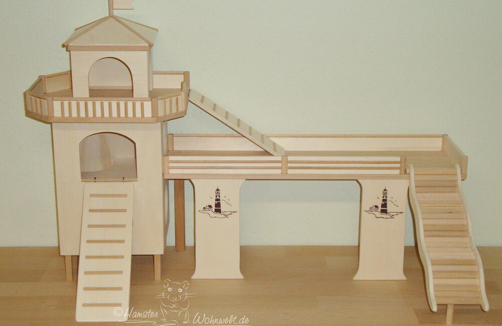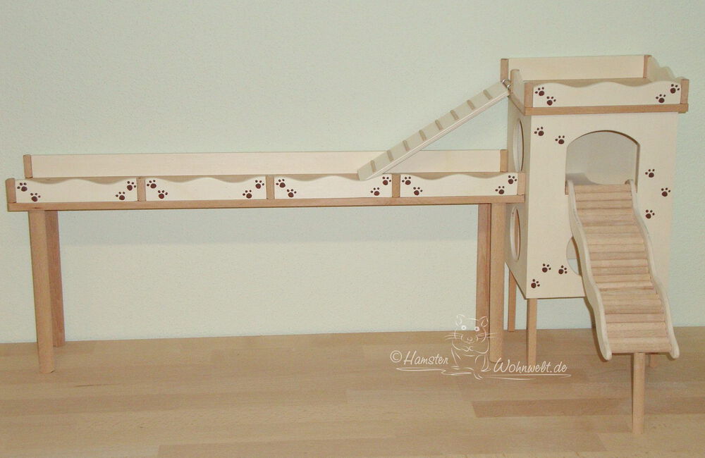 Grundsätzlich beinhaltet ein Kletterturm ein oder zwei einhängbare, gerade Rampen für den Auf- und Abstieg des Turmdaches sowie des vorderen, oberen Durchgangslochs. Diese Rampen tausche ich auf Wunsch gern durch eine geschwungene Abenteuerbrücke aus, die dann dort eingehängt wird. Diese Brücken geben dem Tier guten Halt durch die geriffelte Oberfläche, und somit wird für dem Nager das Beklettern sicherer und auch noch im hohen Alter möglich gemacht.