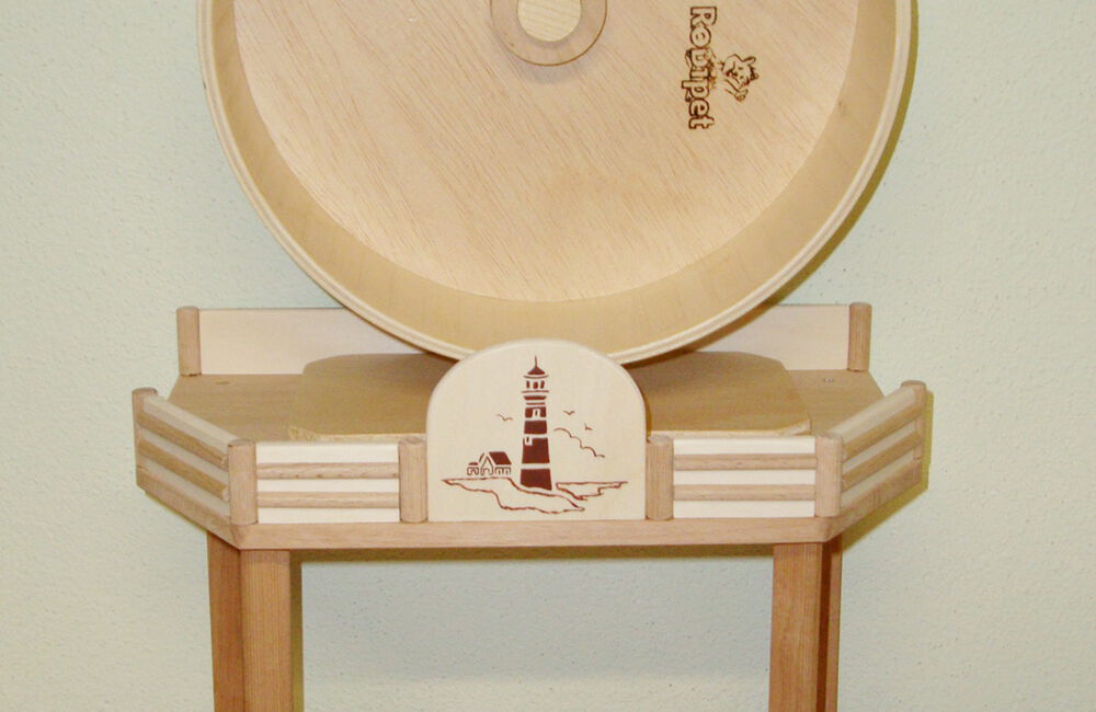 Freistehende Laufrad-Ebenen können überall im Gehege platziert werden und sind mit einer Rampe ausgestattet, sofern die Ebene höher als die Einstreukante ist. Gerne baue ich auch eine geschwungene Abenteuerbrücke dazu, die an der Ebene eingehängt wird.